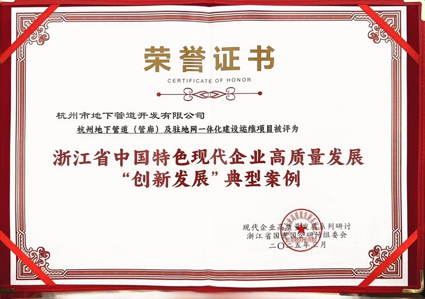集團(tuán)所屬地下管道公司申報(bào)的杭州地下管道(管廊)及駐地網(wǎng)一體化建設(shè)運(yùn)維項(xiàng)目榮獲“浙江省中國(guó)特色現(xiàn)代企業(yè)高質(zhì)量發(fā)展‘創(chuàng)新發(fā)展’典型案例”。